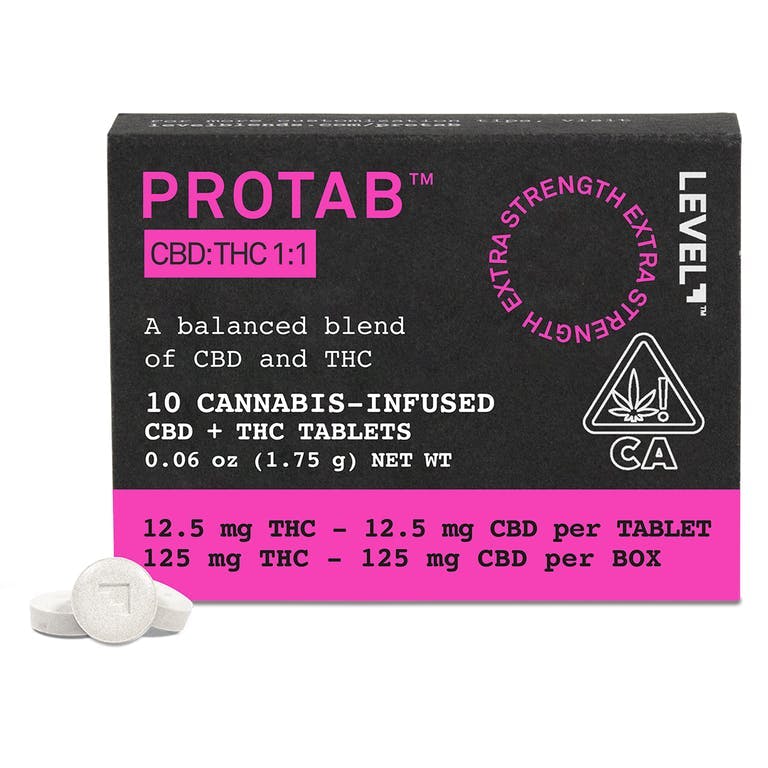 Harnessing the synergy between ∆9 THC and CBD, the LEVEL 1:1 Protab provides a balanced, euphoric high, decreasing the intensity that sometimes occurs when using ∆9 THC by itself. This classic 1:1 ratio of ∆9 THC and CBD is one of the most popular formulations due to the entourage effect produced by these two popular cannabinoids. Each extra-strength tablet contains 12.5 mg of THC and 12.5 mg of CBD with 10 tablets to a box for a total of 250 mg. The Protab is intended to be swallowed with liquid, takes effect in 30–90 minutes, with a duration of 3–6 hours. Should you want to consume a lighter dose, they’re scored so you can easily split one in half.