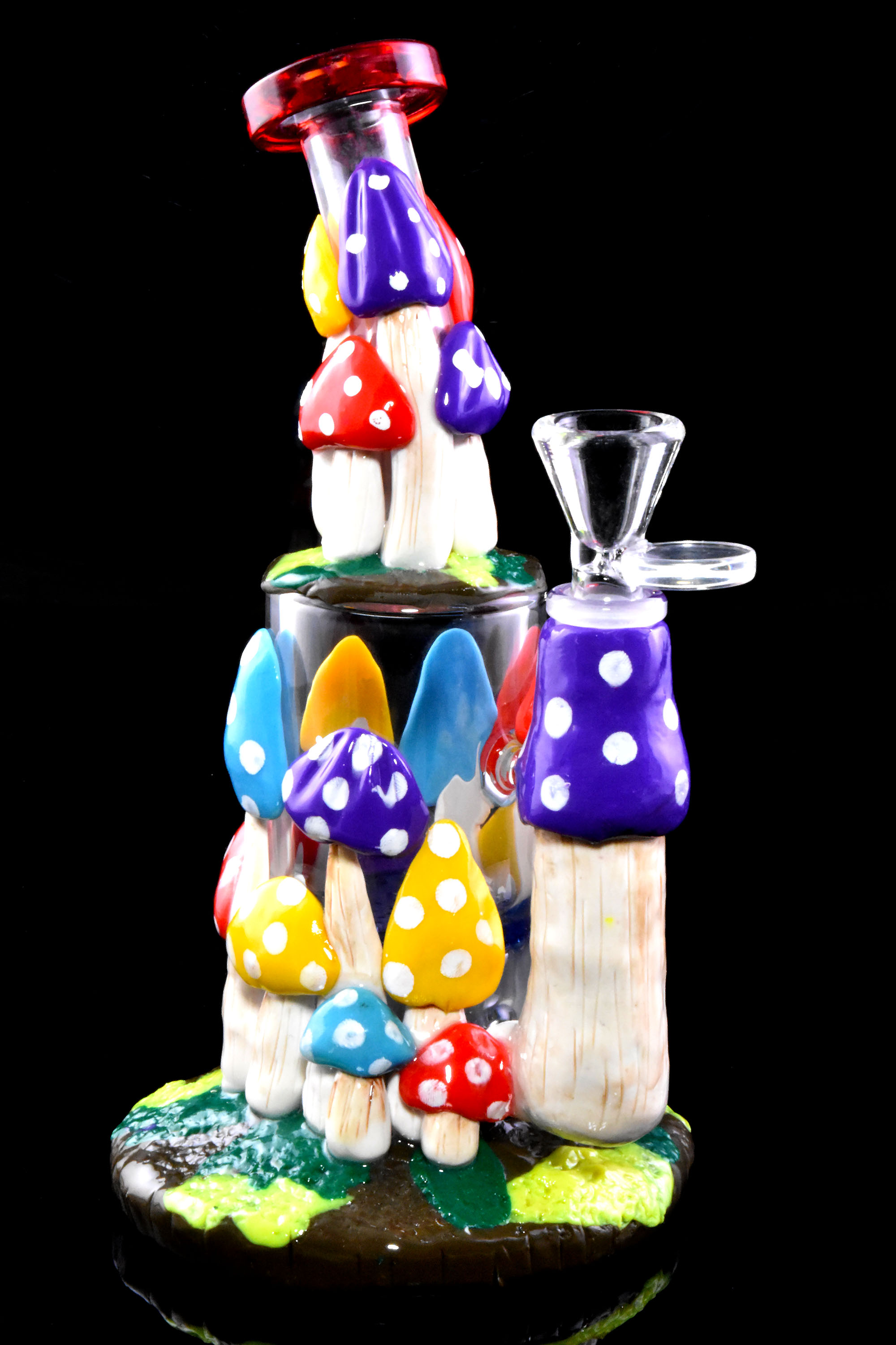 Small stemless glass on glass bent neck straight shooter with honeycomb disc percolator, colored glass accents and resin mushroom design. Colors may vary. 14.5mm female connection. Approximate size: 8.5" Approximate weight: 600g